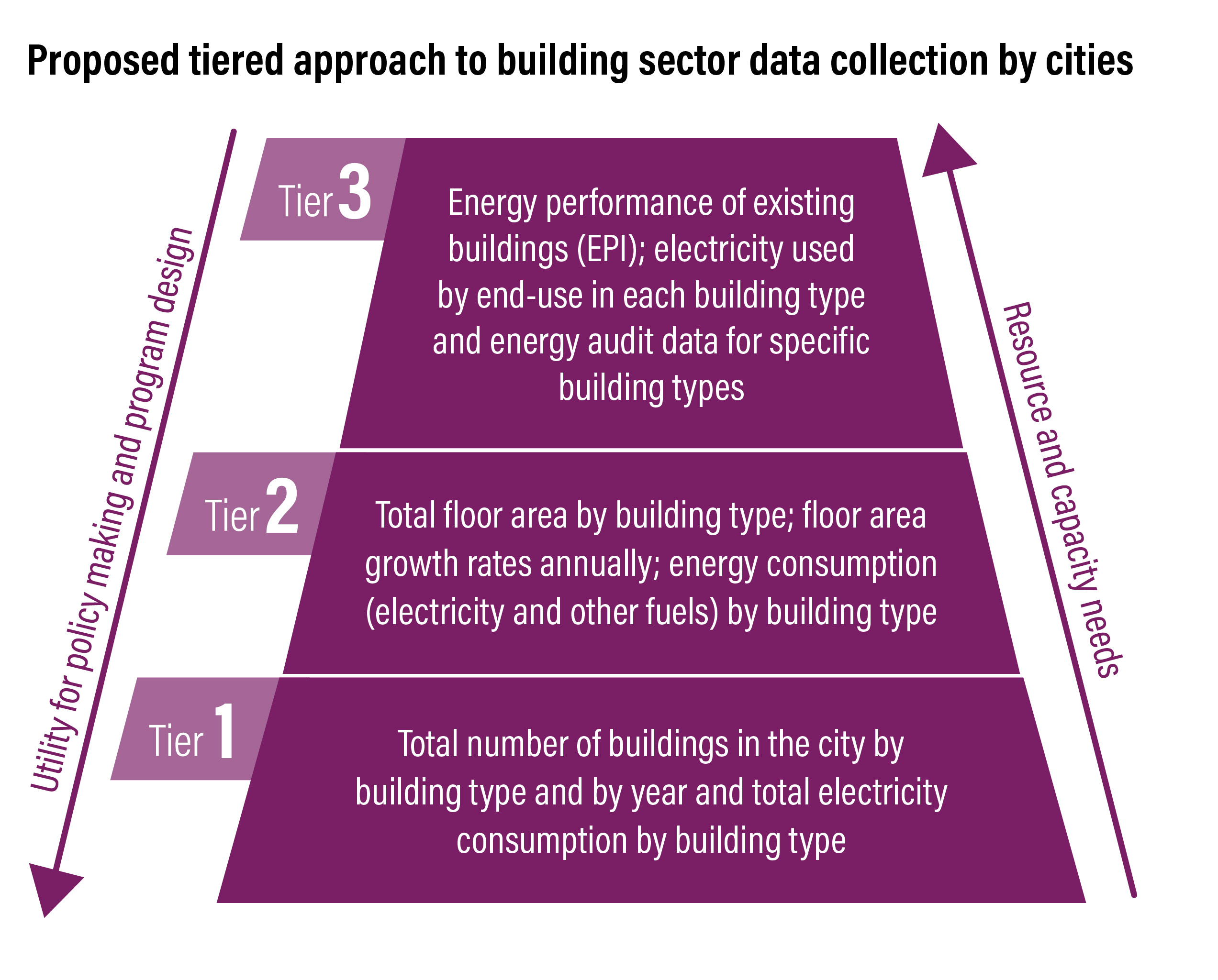 First, an all or nothing approach to collect building stock and energy data is unwise. Second, any data collection efforts must address the capacity constraints in Indian cities and limited professional expertise in data collection and analysis. Cities can consider a tiered approach