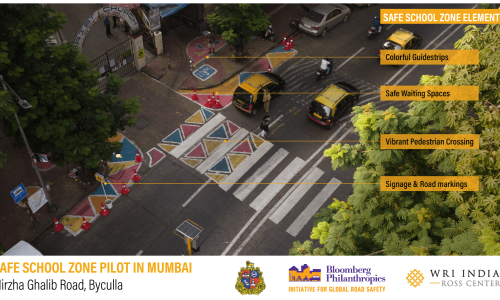 The ‘Safer Access to Schools’ project was undertaken under the Bloomberg Philanthropies Initiative for Global Road Safety (BIGRS). It aims to create child-friendly and walkable school zones in Mumbai. The trial includes testing design solutions that make the road walkable, barrier-free, safer, and more vibrant for all road users, especially children.
