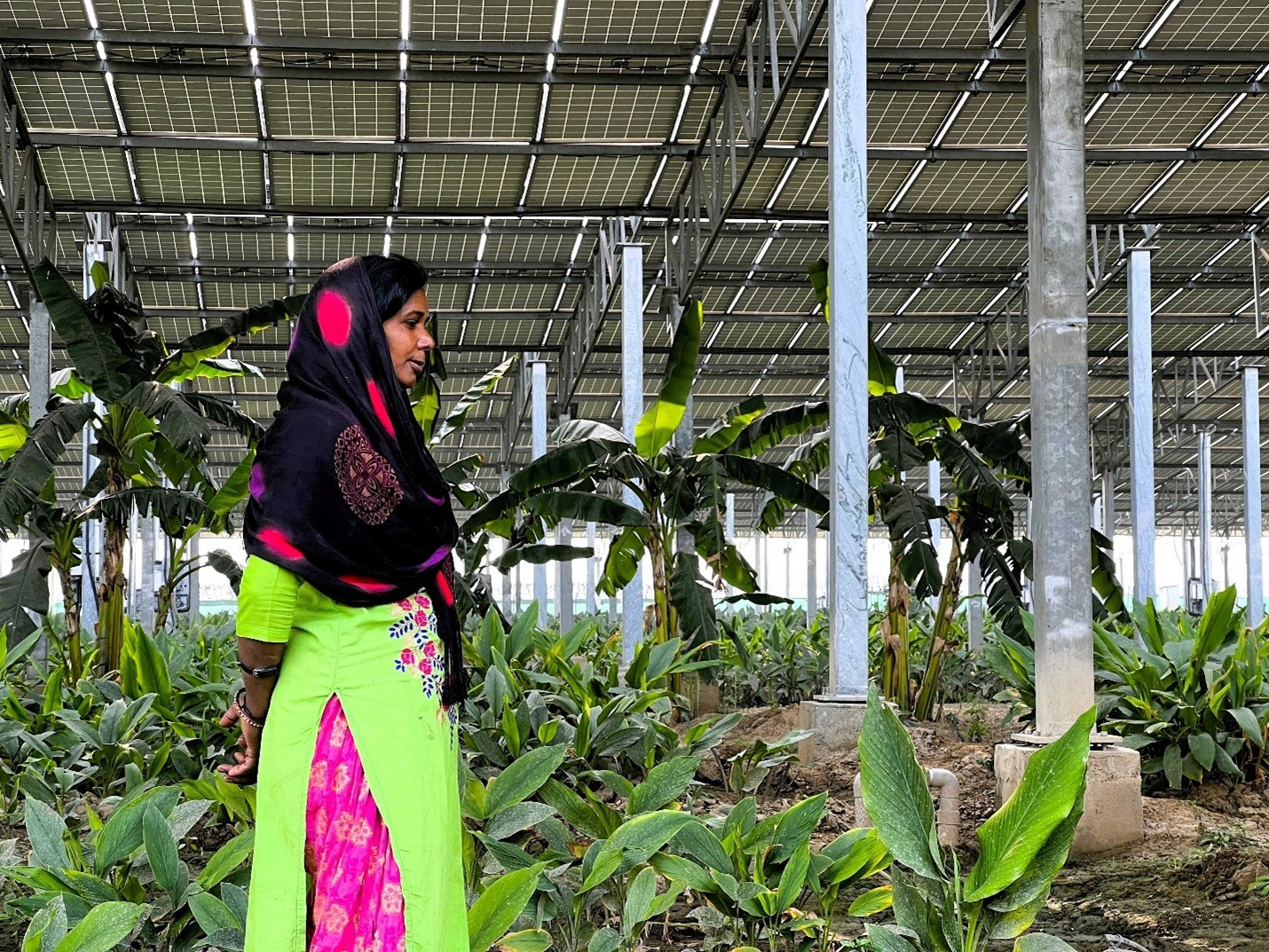 Co-locating solar and agricultural activities has the potential to sustain and improve women’s livelihoods, who make up two-thirds of India’s agricultural workforce. Laxmidevi, who has been with the plant since its inception in 2021, lost her previous job at a local factory during the COVID-19 pandemic. The Issapur plant provided her with the opportunity to earn a stable income within her village.