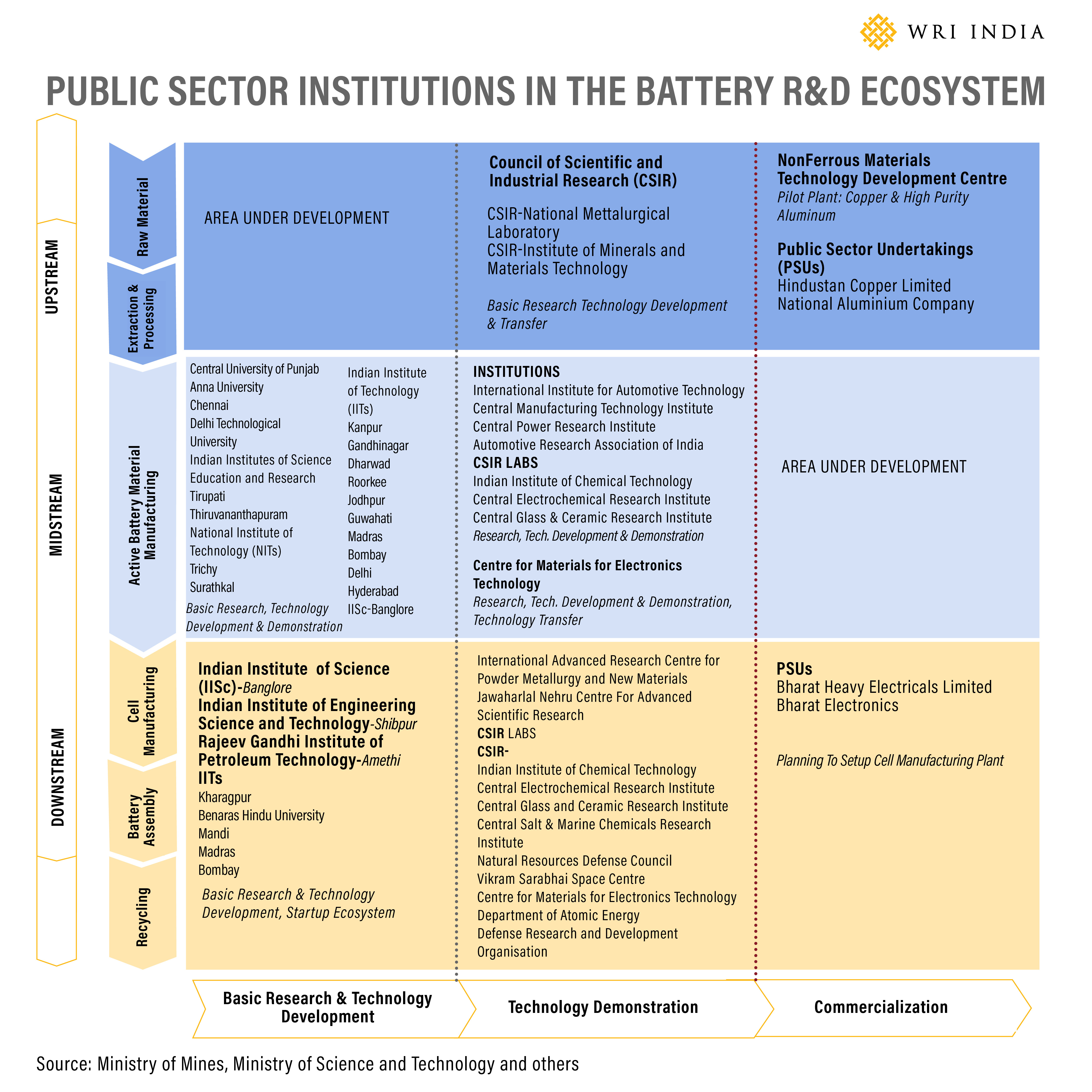 Government Sector: Research institutions, laboratories and public sector undertakings (PSUs) under various ministries are working on various aspects of the battery supply chain and its technological development - from raw material extraction and processing to cell manufacturing and recycling (as shown in figure 3).