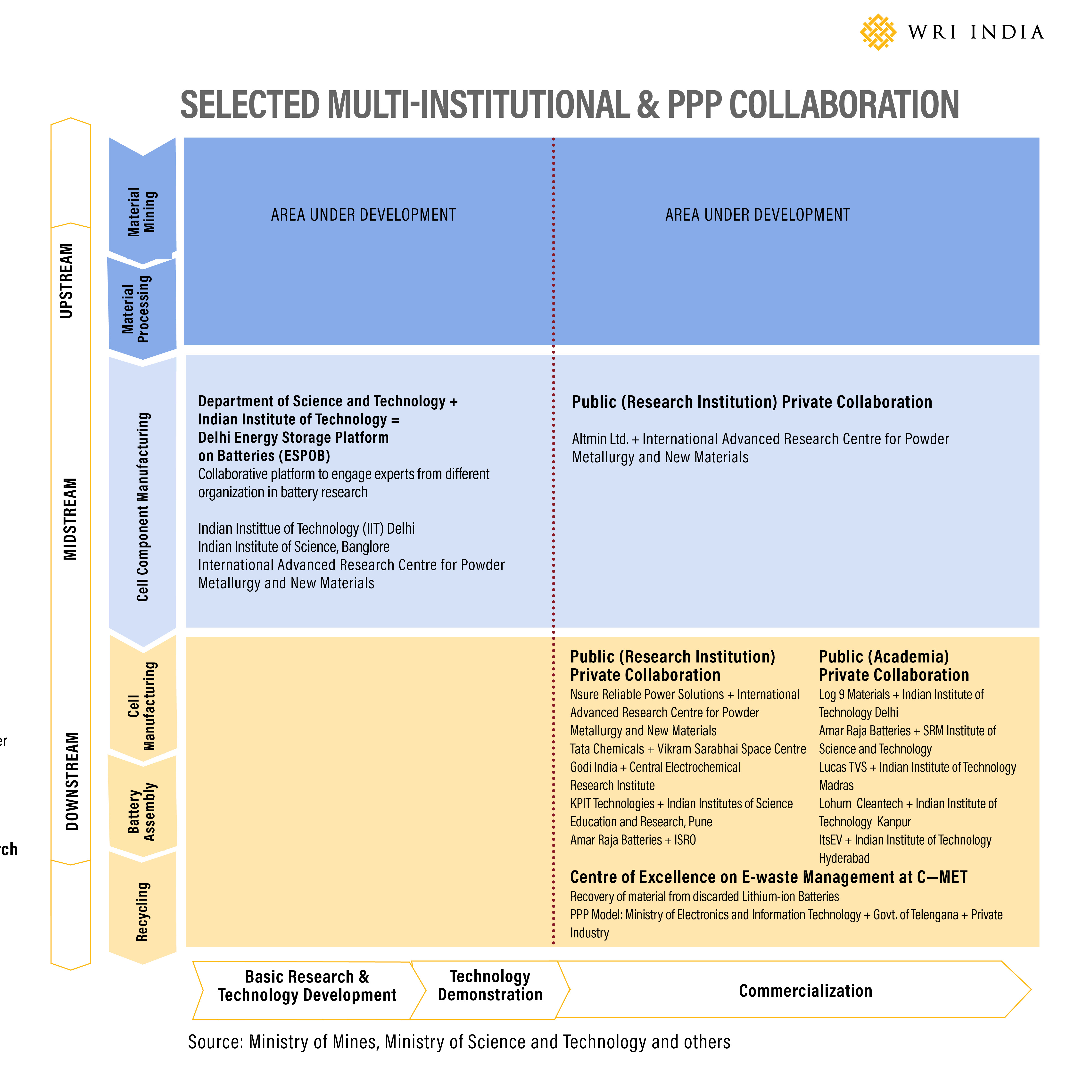 Public-Private-Partnerships: Most PPPs focus on commercializing technologies, especially at the cell and battery pack level (see Figure 6). For instance, the Centre of Excellence on E-waste Management at Centre for Material for Electronic Technology (C-MET) developed and transferred a cost-effective recycling technology, for discarded LIBs, to nine startups.