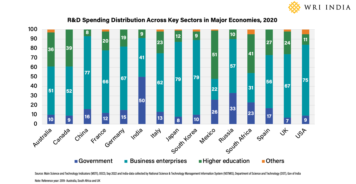 In 2020, India’s Gross Expenditure on R&D (GERD) was 0.64% of its gross domestic product (GDP). This is lower than countries like China (2.4%), USA (3.4%), South Korea (4.7%) and Japan (3.2%). In India, the government remains the primary contributor to GERD while business entities contribute only 41%, unlike countries such as China, the USA, Japan, and South Korea, where business enterprises contribute more than 70%. (As shown in figure 1).