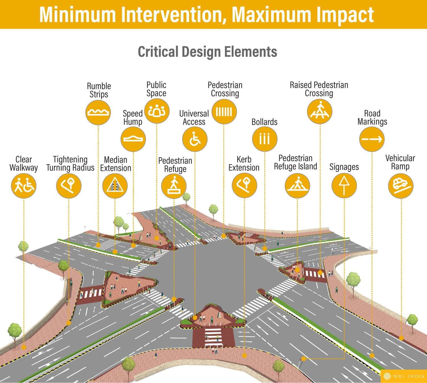 Compact junctions reduce pedestrian exposure to traffic and thus minimize crash risks. Key elements such as extended curbs, median extensions and reduced crossing distances facilitate easy pedestrian navigation. Tightened turning radii also deter speeding vehicles. Reclaimed spaces can be repurposed for pedestrians and cyclists, in line with the Vision Zero initiative, that emphasizes achieving zero road fatalities by 2050 and prioritizes human life over other traffic-related issues. Simplified geometry, through low-cost tools, enables effective implementation, yielding significant safety improvements.
