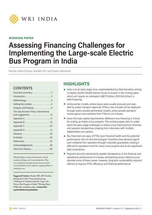 This working paper aims to understand the early-stage challenges in India’s e-bus financing from financier and operator perspectives, drawing from various stakeholders and expert consultations. It also provides insights into the critical interventions needed to encourage Public-Private Partnerships (PPP) aimed at accelerating the deployment of large-scale e-bus projects to build a sustainable, affordable, and resilient public transport ecosystem.