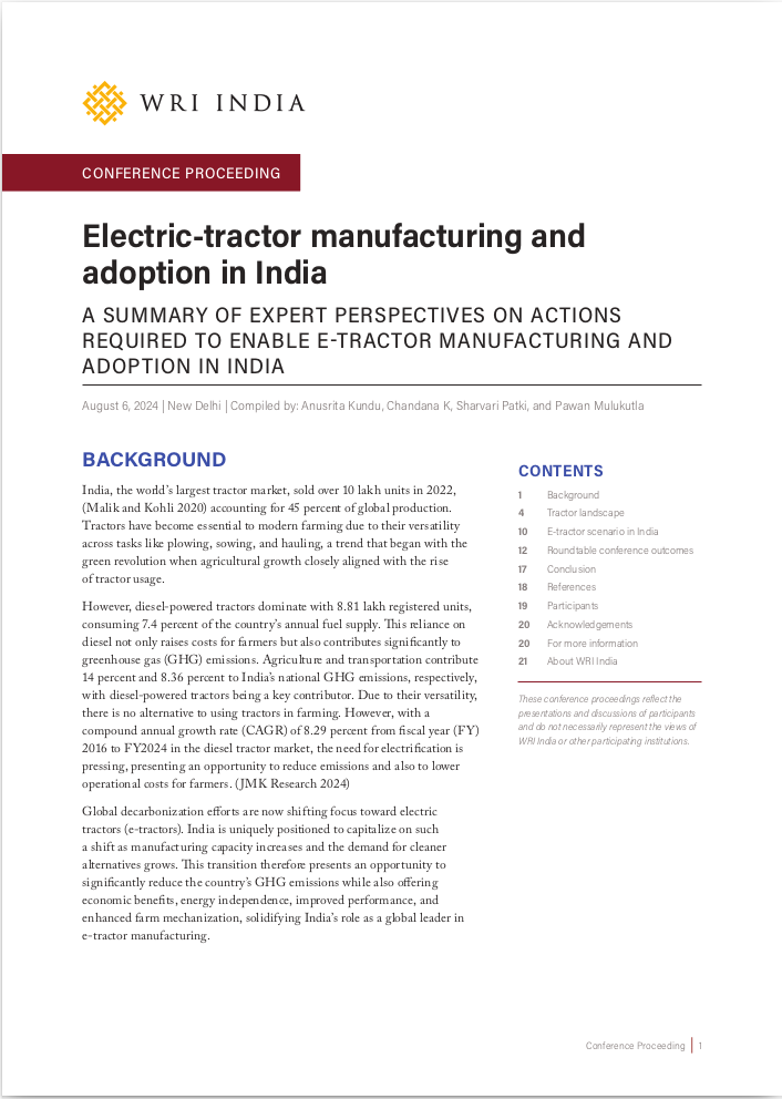 On August 6, 2024, WRI India convened the “EV Revolution: Accelerating E-Tractor Manufacturing and Adoption” roundtable in New Delhi. This gathering brought together decisionmakers, industry leaders, financial institutions, knowledge partners, and farmers to address key adoption barriers and chart a pathway for India’s e-tractor transition, particularly in Uttar Pradesh. Uttar Pradesh already leads India's tractor sales and is well-placed to become a hub for e-tractor manufacturing in India.