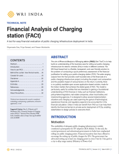 The MS-Excel-based tool ‘Financial Analysis of Charging station (FACt)’ (the “Tool”) has been developed to help build an understanding of the business case for rolling out public charging infrastructure for electric vehicles (EVs) in the Indian context. It is a flexible, transparent, and user-friendly solution to the problem of conducting a quick preliminary assessment of the financial justification for setting up a public charging station. The wide-ranging outputs from the Tool provide a well-rounded view of the financials of a public charging infrastructure project, including the project cost composition and the possible impact of various factors on the return. Currently, there is no publicly available open access application-based solution, made for the Indian market, that achieves the stated goals of FACt.