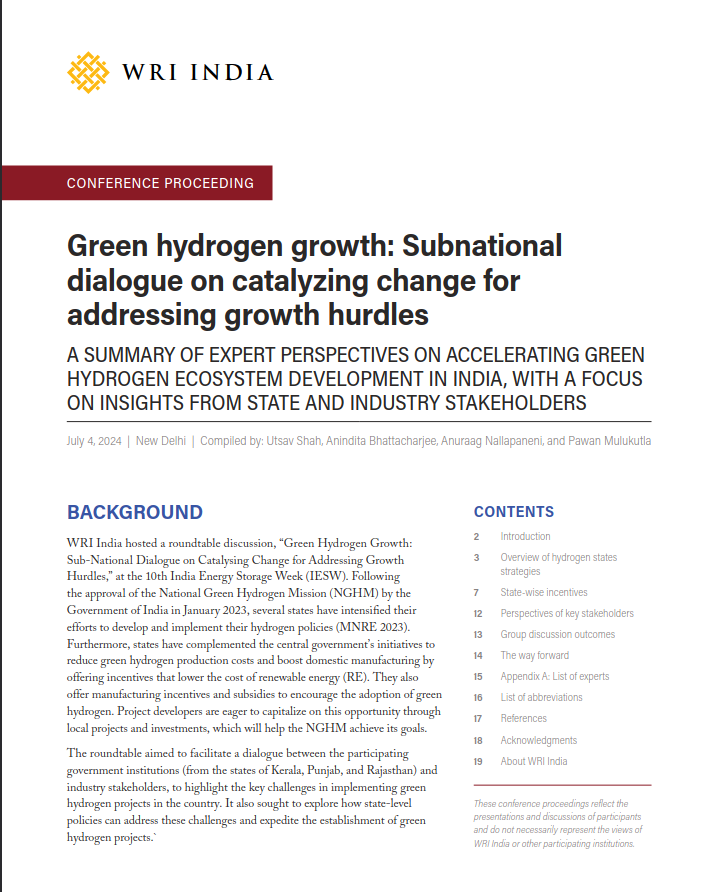 WRI India hosted a roundtable at the 10th India Energy Storage Week to discuss challenges and opportunities in green hydrogen adoption. Representatives from Kerala, Punjab, and Rajasthan engaged with industry stakeholders to explore state-level policy support, alternative production pathways, and global trade dynamics. The discussion highlighted key hurdles and strategies to accelerate green hydrogen deployment in India.