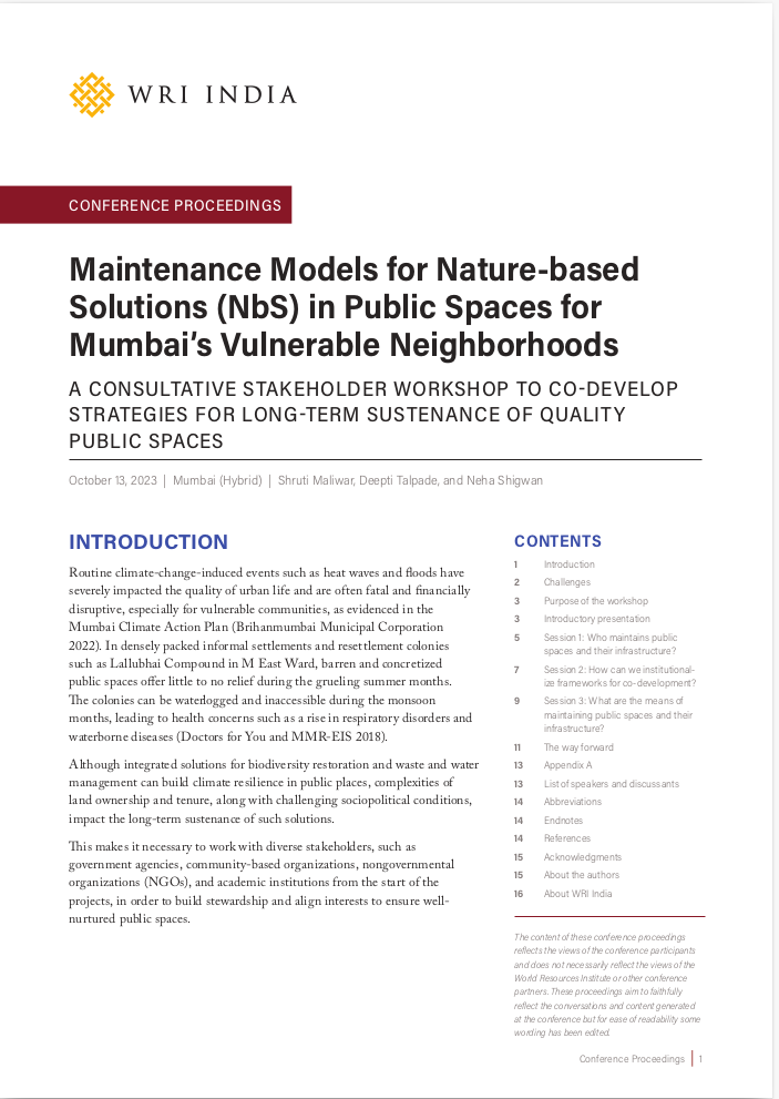 ‘The proceedings summarize the reflections of stakeholders from a workshop hosted in October 2023 by WRI India in partnership with the Youth for Unity and Voluntary Action (YUVA). The intention of the workshop was to explore collaborative maintenance models for the ecological restoration of underused public open spaces in Mumbai’s low-income communities (R&R colonies, transit accommodations and self-organised settlements).