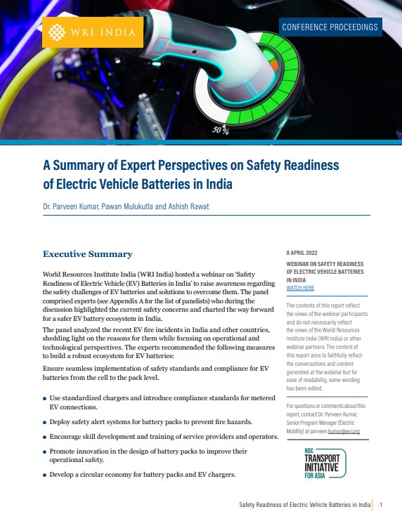 World Resources Institute India (WRI India) hosted a webinar on ‘Safety Readiness of Electric Vehicle (EV) Batteries in India’ to raise awareness regarding the safety challenges of EV batteries and solutions to overcome them. This document highlights the insights shared by the panelists on the current safety concerns and the way forward for a safer EV battery ecosystem in India.