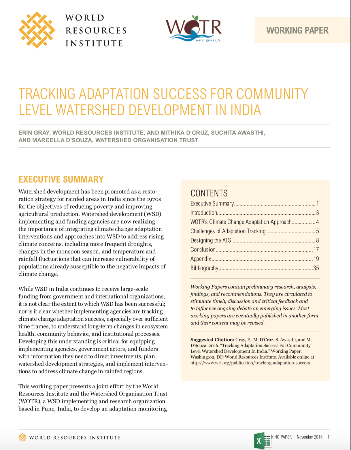 This working paper presents a joint effort by the World Resources Institute and the Watershed Organisation Trust (WOTR), a WSD implementing and research organization based in Pune, India, to develop an adaptation monitoring and evaluation (M&E) or tracking system to track success of WSD projects in terms of achieving climate change adaptation objectives. The goals of this paper are twofold: (1) to design an adaptation tracking system (ATS) for WOTR and share recommendations and lessons learned from this experience with the wider WSD community; and (2) to provide context on adaptation M&E or tracking and its challenges.